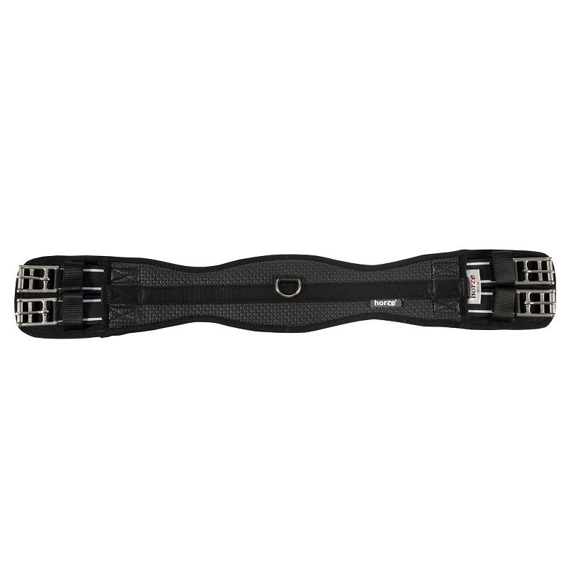 The ergonomically-shaped design of this soft, webbed dressage girth offers ultimate comfort and durability. The double-ended elastic, stainless steel roller buckles and center D-ring provide convenience and quality. The fabric is easy to clean and will maintain its great looks with minimal care.