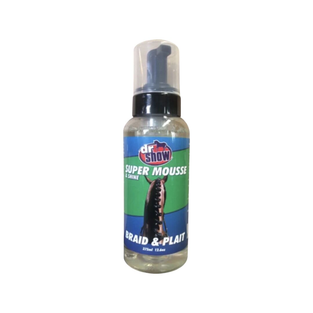 Dr Show Super Mousse Braid Plait achieves a professional hold and minimises fluff. Make hair manageable while plaiting and has a gentle yet firm adhesive quality that holds the hair perfectly without feeling tacky. Produces a healthy shine to enhance perfect plaits. Safe to use a neck rug or hood so the plaits stay in place and the water base formula will simply wash out with no sticky residue. 375ml