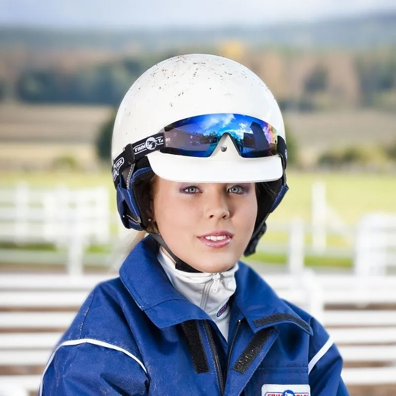 Stylish trotting helmet with visor and artificial leather ear pieces.