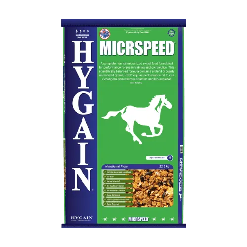 HYGAIN® MICRSPEED® is a non oat micronized sweet feed formulated for performance horses in training and competition. This scientifically balanced formula contains a blend of quality micronized grains, HYGAIN® RBO® Equine Performance Oil®, Yucca Schidigera and essential vitamins and bio-available minerals.