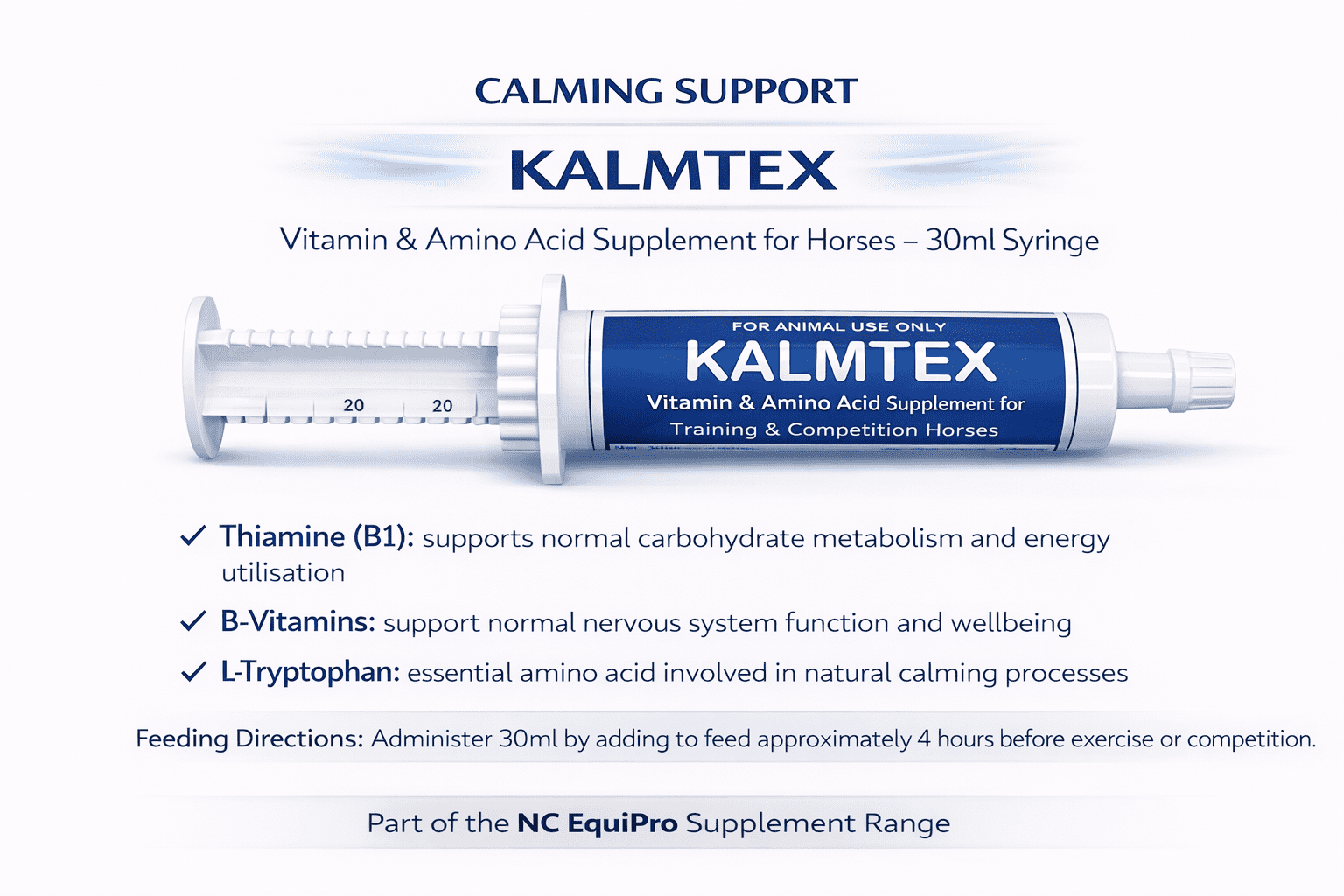 Kalmtex is a carefully balanced blend of Thiamine Hydrochloride (Vitamin B1) and L-Tryptophan, designed as a vitamin and amino acid supplement for training and competition horses.