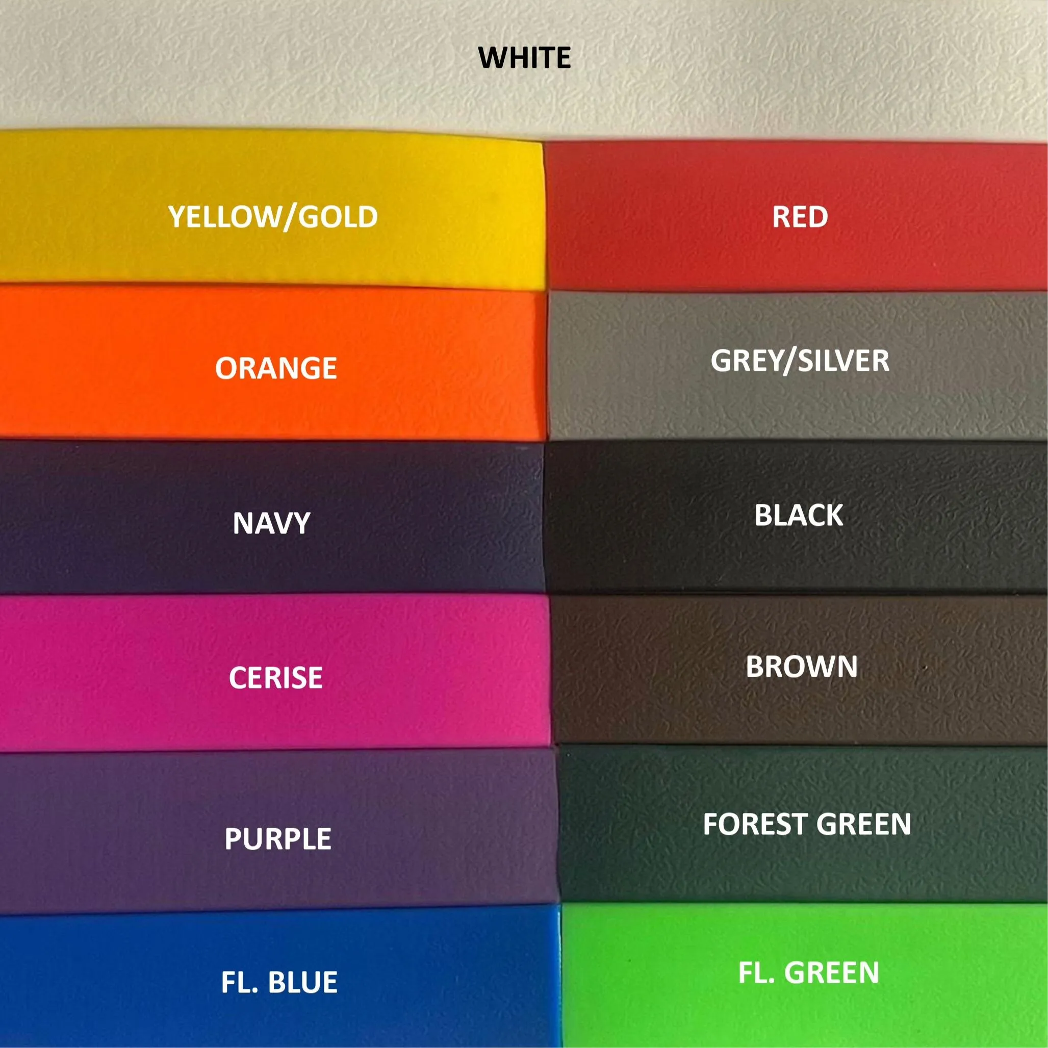 | PVC Colour | Black, Brown, Cerise Pink, Fluro Blue, Fluro Green, Forest Green, Grey, Navy Blue, Orange, Purple, Red, White, Yellow |
