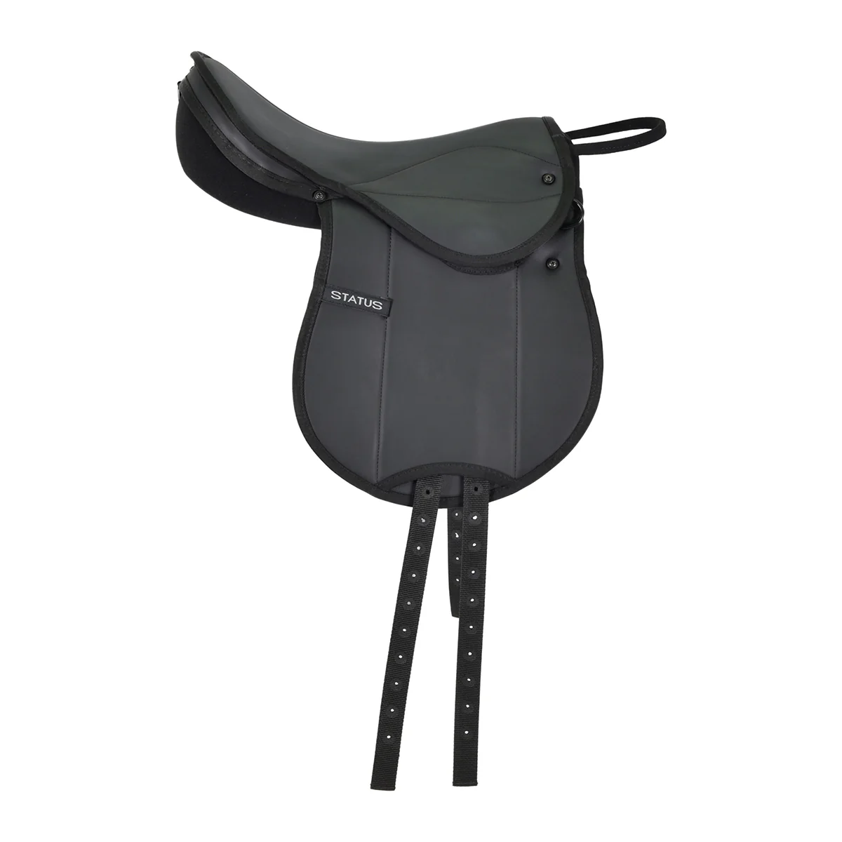 The Status Mounted Pony Pad is a leather look pony pad in black.